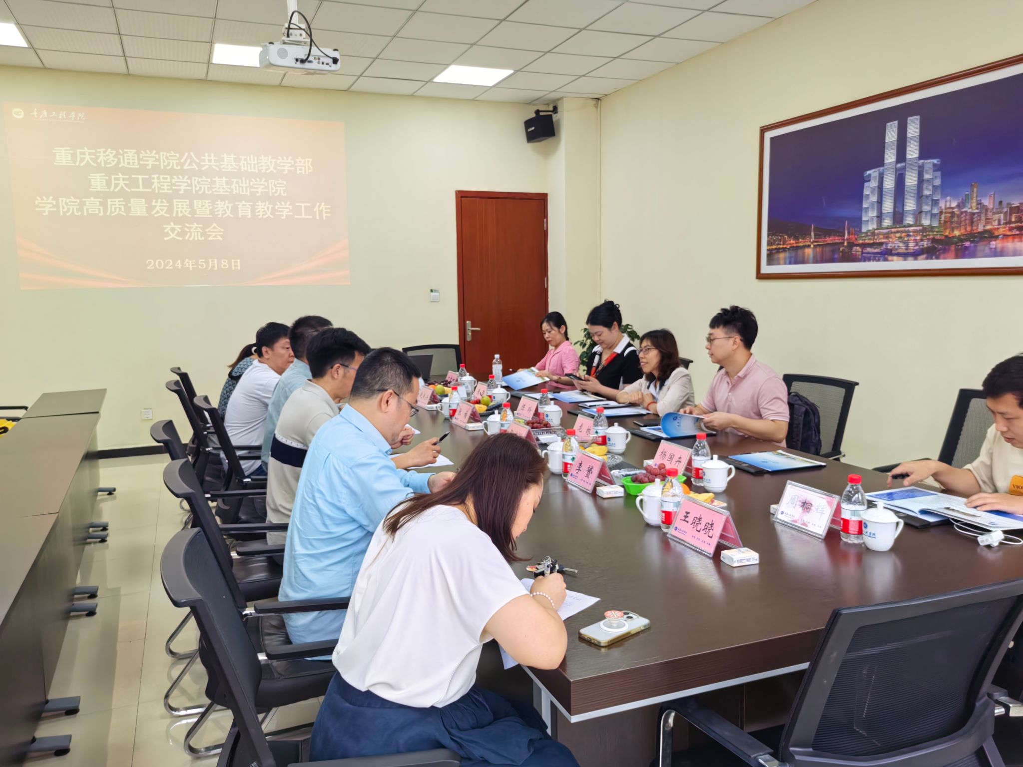 抵达重庆工程学院后,双方负责人和骨干教师齐聚一堂,一场别开生面的座谈会开始了。首先,重庆工程学院基础学院张楠副院长发表热情洋溢的致辞,详细而全面地介绍了该校和本学院的历史沿革、学科建设、组织架构以及师资力量等概况,让我校人员对其有了更为清晰和深入的了解。接着,我校公共基础教学部陈玲副主任也对本校的发展历程、办学特色以及教学理念等方面进行了详细概述,尤其是本部门的组织架构、教学工作以及师资力量等重点内容。