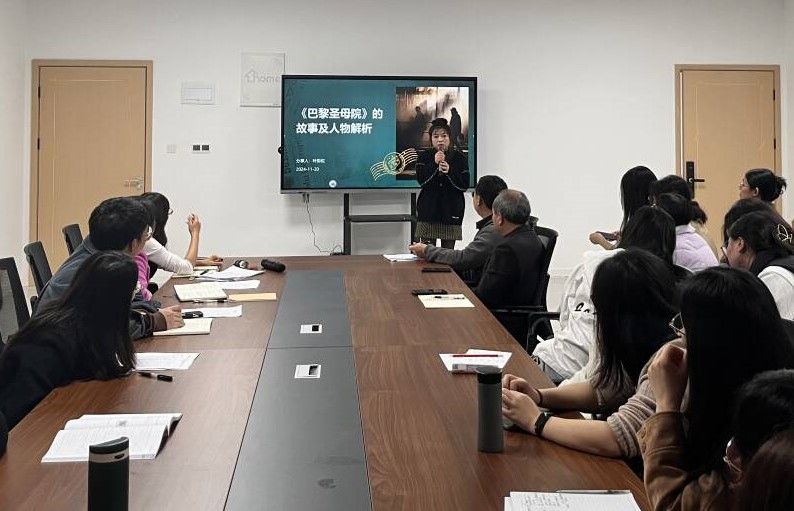 在分享会上,叶老师首先对《巴黎圣母院》的作者维克多・雨果以及作品的创作背景进行了详细介绍,使在场师生对这部作品产生的时代语境有了更为清晰的认识。随后,叶老师深入剖析了书中主要人物的性格特点与命运走向。卡西莫多的外貌丑陋却内心善良、纯真,他对爱斯梅拉达的无私守护令人动容;爱斯梅拉达的美丽、善良与勇敢,在那个黑暗的时代背景下显得尤为耀眼,却也因种种误解与迫害而命运悲惨;副主教克洛德则展现出了人性中复杂的一面,他的宗教身份与内心的欲望产生激烈冲突,最终导致了一系列悲剧的发生。
