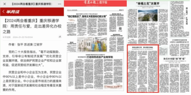 1月,权威媒体《半月谈》以《【2024两会看重庆】重庆移通学院:用责任与爱,走出差异化办校之路》为题报道我校差异化办学特色。4月,中国教育报发表稿件《重庆移通学院:城市变课堂,让社会成为学生成长成才“第二课堂”》。5月,《经济日报·中国县域经济报》以《强化品牌引领 推动教育创新 重庆移通学院致力于成为“双一流之外的首选大学”》为题,介绍我校全新品牌价值主张及办学愿景。7月,《中国质量报》在2版以《重庆移通学院毕业生就业率连年居高》为题,报道我校毕业生就业方面的优秀表现。10月,中国教育在线专版专题页面报道中德重庆国际教育论坛。11月,重庆日报以《持续提升服务经济社会发展水平 重庆移通学院打造特色信息产业商学院》为题,半版篇幅报道我校的创新人才培养模式。