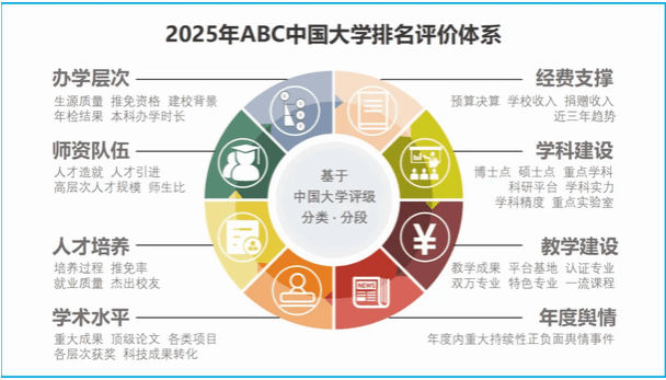 ABC中国大学排名由ABC排名咨询机构独家编制,研究对象超5500所世界各类高校,ABC中国大学排名涵盖1210所全国所院校。作为ABC排名系列榜单年度重磅研究成果,该榜单宏观体现国内高校综合竞争力。研究成果在教育界和社会各界均获得了高度认可,为广大考生升学、学校发展提供了重要决策依据;媒体和学术影响力深远,包括人民网、光明网、凤凰网以及各大日报等权威媒体进行了广泛报道,实现排名结果全网全覆盖,权威性和影响力在国内处于领先梯队。