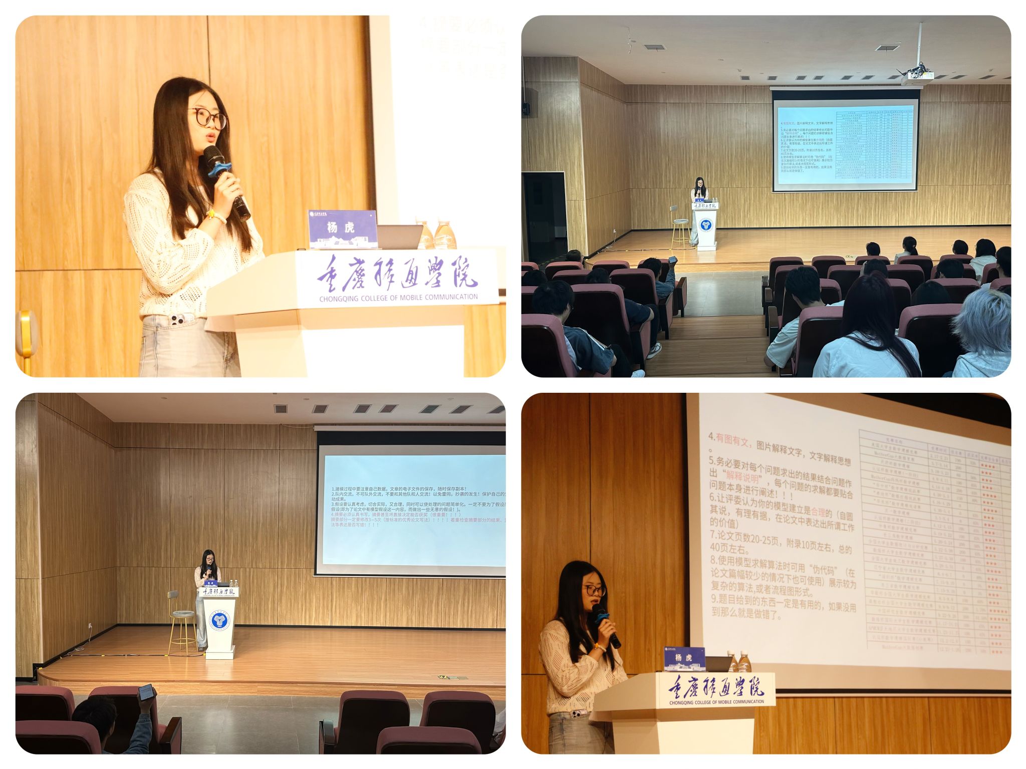 全国大学生数学建模竞赛是培养学生创新思维、团队协作和解决实际问题能力的重要平台。为帮助本届参赛学生深入了解数学建模竞赛的流程、技巧和策略,提升建模、编程、论文写作等竞赛必备能力,增强参赛信心,提高竞赛整体水平。綦江校区数理教学部于2025年5月14日在贤者楼131报告厅进行数学建模竞赛经验交流分享会。