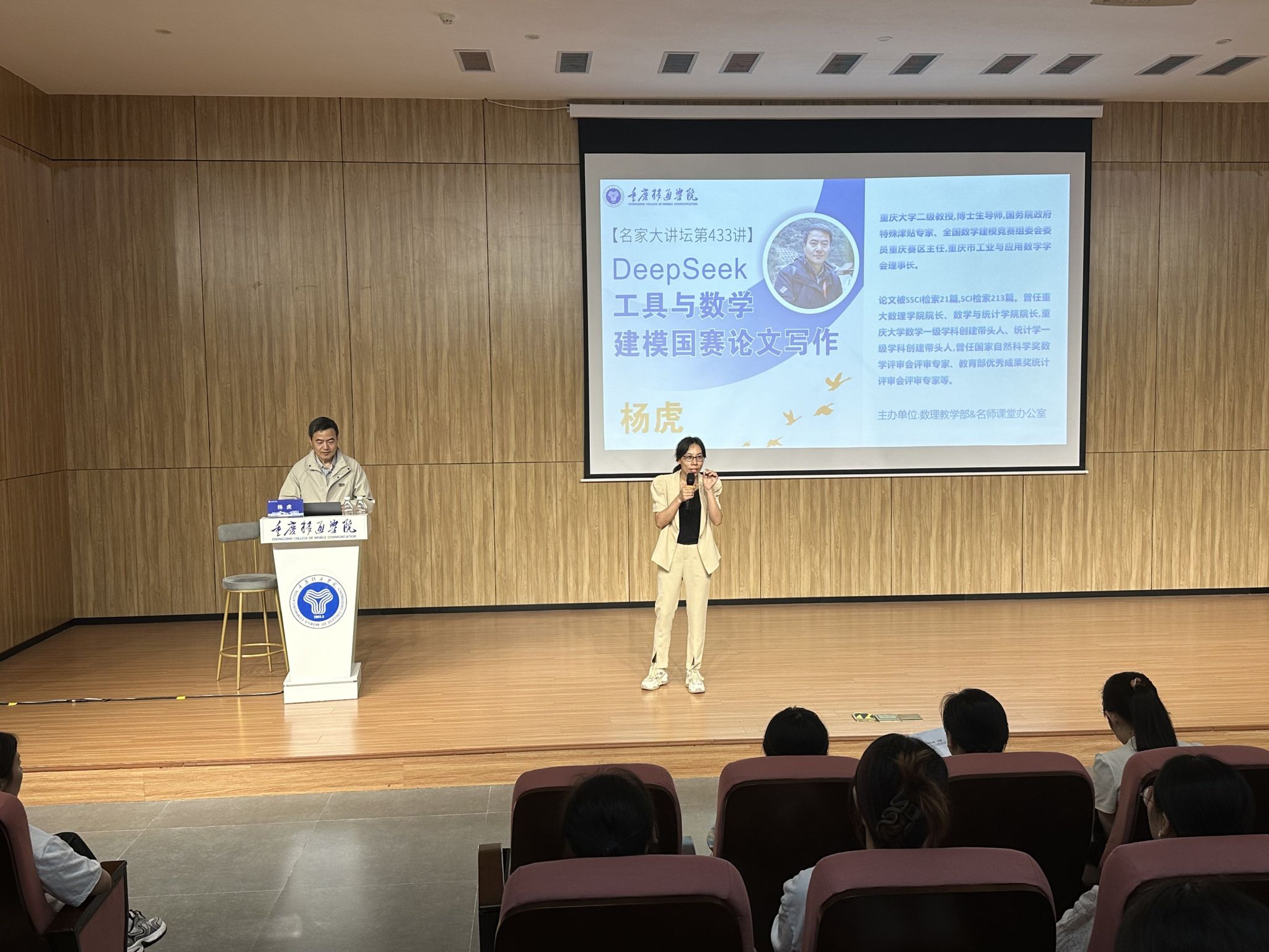 为提升数学建模竞赛备赛质量,赋能师生专业能力成长,5月14日下午,全国数学建模竞赛组委会委员、重庆赛区主任,重庆市工业与应用数学学会理事长,重庆大学杨虎教授,应邀莅临我校“文化移通——名家大讲坛”,于重庆移通学院綦江校区贤者楼131报告厅开展了题为《DeepSeek工具与数学建模国赛论文写作》的讲座。本次讲座吸引了全校数学建模指导教师及2025年全国大学生数学建模竞赛参赛学生等300余人参与,讲座由数理教学部副主任陈玲老师主持,为师生带来了前沿的技术应用与论文写作经验分享。