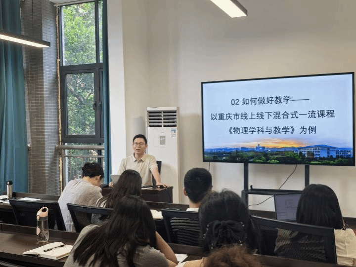 在教学创新方面,朱教授以重庆市线上线下混合式一流课程《物理学科与教学》为例,详细介绍了“课前线上预习-课堂重点突破-课后拓展延伸”的三段式教学模式。他强调:“现代物理教学要注重信息技术与传统课堂的深度融合,通过数字化手段提升教学效果。”