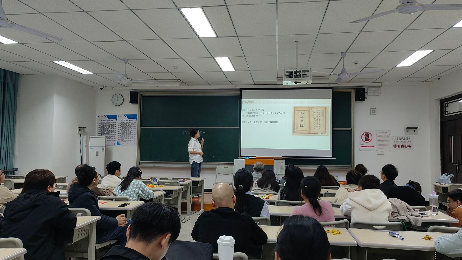 宋美伦老师从经典数学谜题“鸡兔同笼”出发,引导学生构建方程组模型,并隆重推出克拉默法则这一优雅的求解工具。她的课堂古今贯通,不仅演示了法则的应用,更将其原理巧妙迁移至“AI算力调配”的现代场景,彰显了数学方法的永恒生命力。