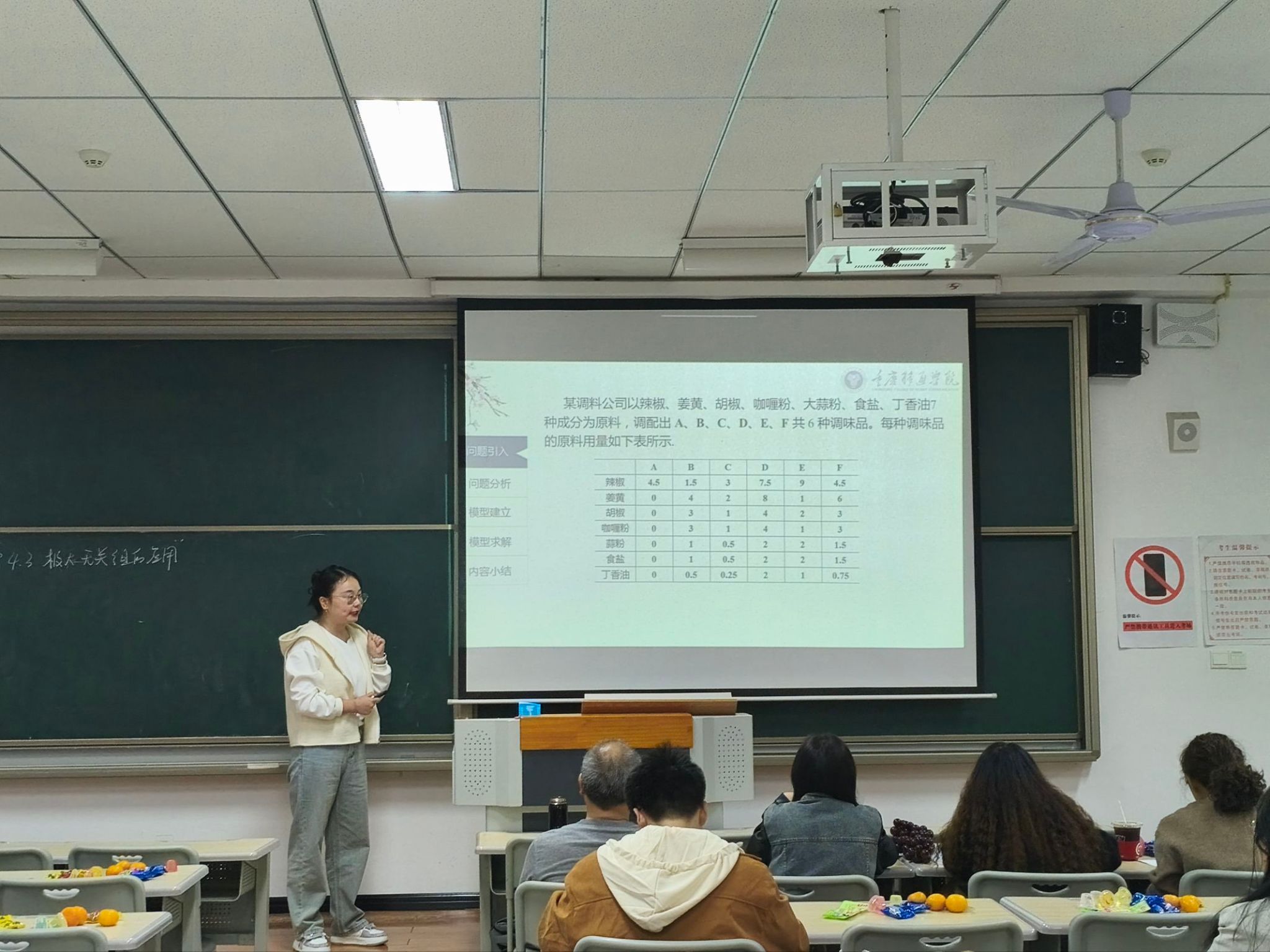 雷成渝老师别出心裁地设问“如何用最少种类的调味品调配出所有口味”,将“极大无关组”这一抽象的代数概念巧妙融入生活情境。她引导学生建立线性方程组,通过矩阵的初等变换寻找最优解集,并特别强调了非负系数的现实意义。整个教学过程层层递进,让学生在解决实际问题的过程中,深刻理解了向量组线性表示的核心思想。