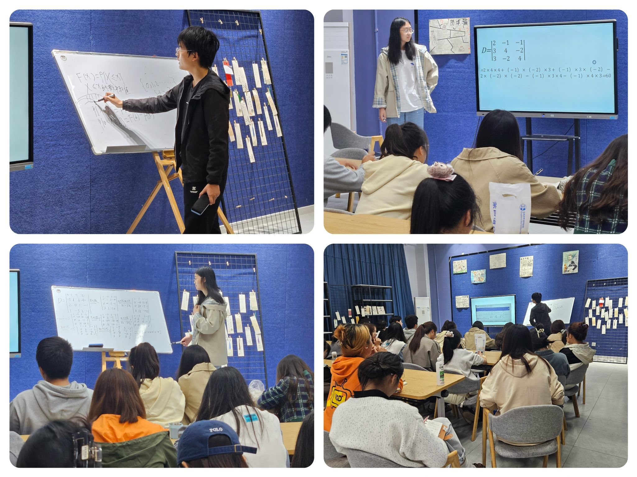 乘众人之智,则无不任也。除理论学习外,活动还设置了丰富的实践环节,参与者分组进行了题目解答,通过例题练习加深了对知识的理解和记忆,实现让学生主动探索问题,巩固知识点的同时培养举一反三的能力。例如李梦瑞分享全概率公式运用、刘睿同学解读行列式性质、朱美玲同学上台讲解高斯消元法。