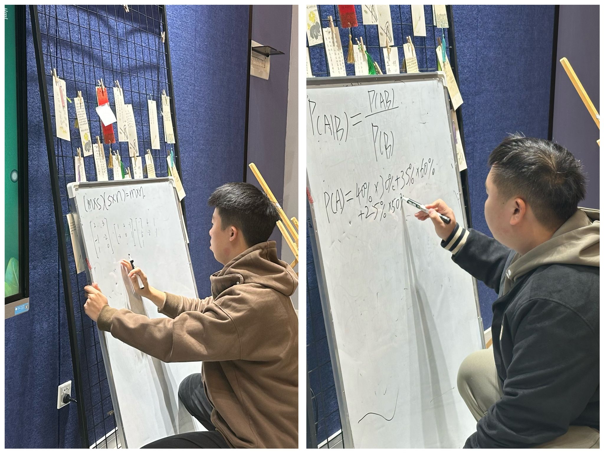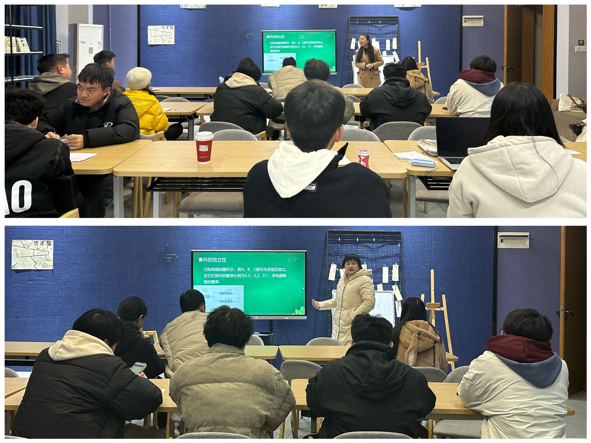 学习启迪智慧,交流构筑桥梁。活动过程中,雷成渝老师和陈若冰老师走访参与者中,与其解疑答惑,同时分享线性代数中的易错点、如何巧妙地求各种概率问题,延伸出多样的解题方法。其中汪越同学上台求解数学期望与方差、陈佳庆同学阐述事件之间运算律的理解、张轩同学延伸矩阵公式运算和线性方程组等。