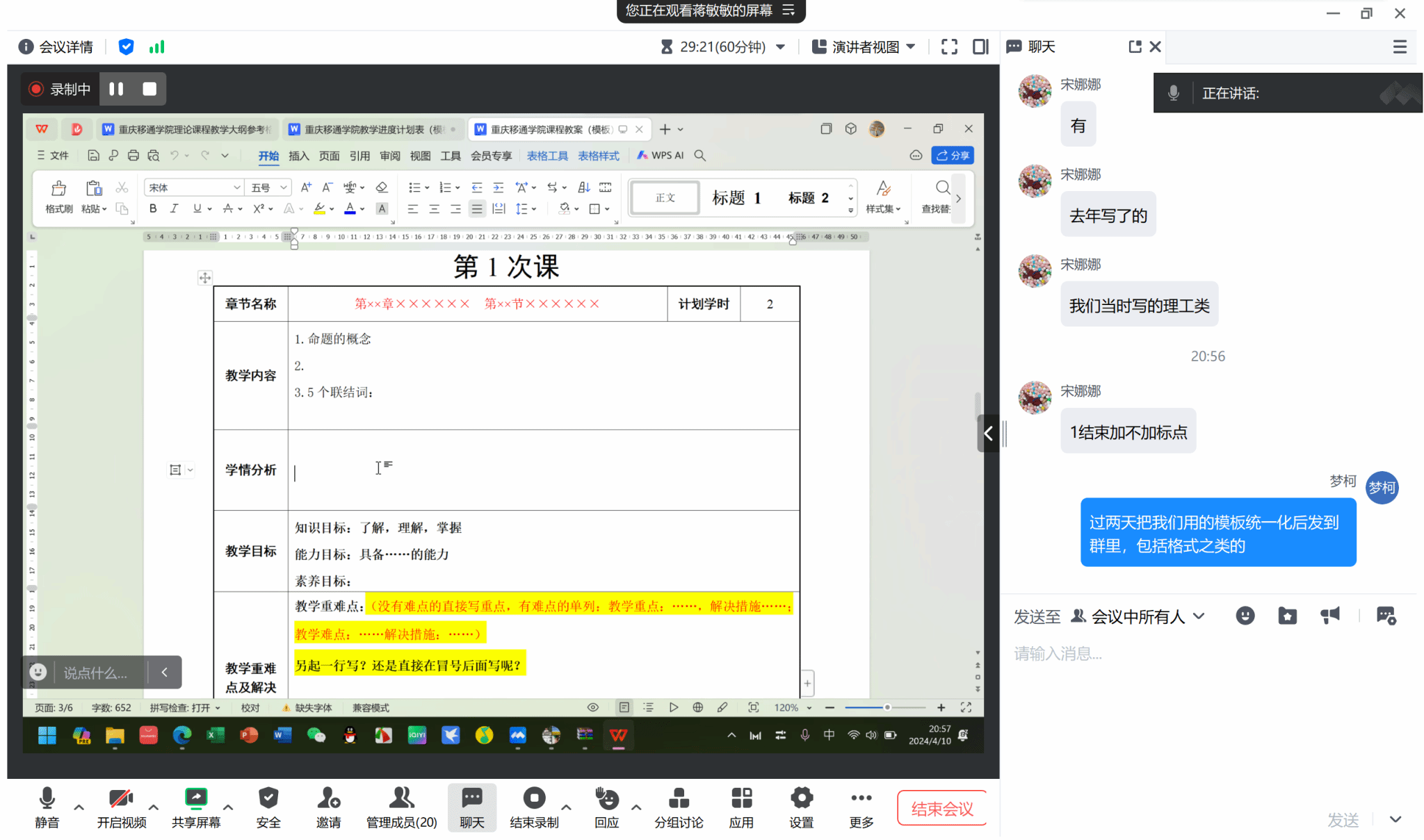 双校区教研室主任在商定好对教学资料建设的初步要求后,公共基础教学部数学教研室主任边梦柯组织双校区各课程负责人于4月10日开展主题为“数学课程教学资料修订”的会议,并协同数理教学部应用数学教研室主任蒋观敏、基础数学教研室主任陈代国对在建设教学资料过程中的要求进行讲解。