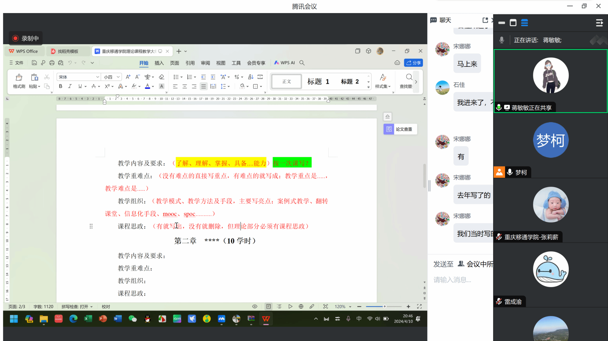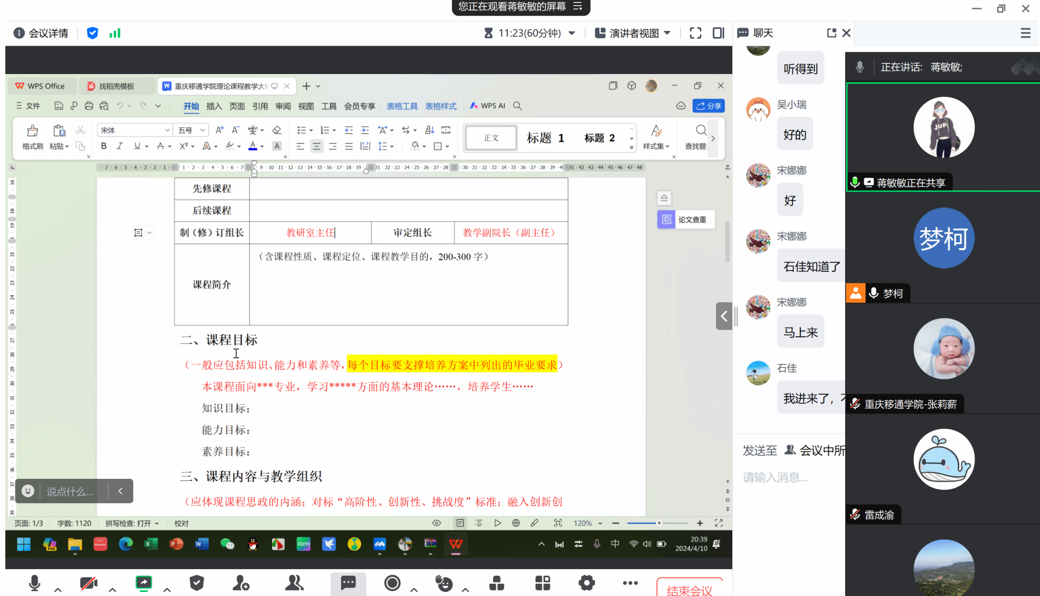 首先,蒋观敏主任强调教学资料为教学指导性文件,应该围绕我校本科人才培养方案的核心目标进行制定,并且保证内容描述准确、规范的基础上,体现人才培养的目标以及课程思政元素,为后续课程开展奠定基础。