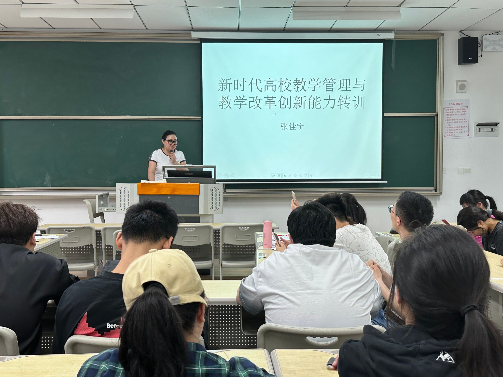 张佳宁老师随后分享了“新时代高校教学管理于教学改革创新能力”的会议精神,特别强调了教学成果奖申报时对关键词的使用,例如:创新创业、交叉融合、联合培养、混合式教学、信息技术融合等等。通过关键词可以反应当前国内高等教育领域的研究热点及发展趋势,紧扣时代脉搏,顺应高等教育趋势,以政策为导向,不断实践探索,凝练可推广的经验,切实提高人才培养质量。教学管理应以学生为中心,通过明确的教学目标和有效的评估机制,不断优化教学方法和教学环境,以适应快速变化的教育需求。