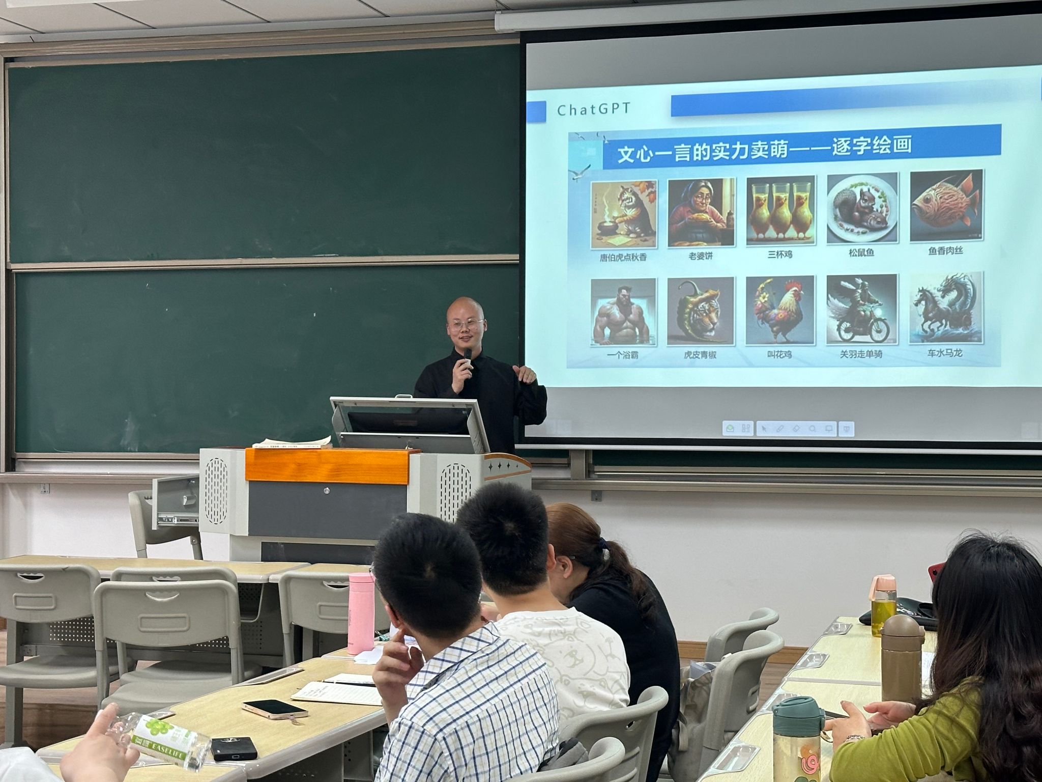 紧接着,程龙老师展示了人工智能在教学资源创新制作中的应用案例,特别是AI如何在教学设计中起到辅助作用,从内容生成到交互式学习工具的开发。程老师的分享突出了技术在教学中的实际应用,展示了如何利用现代科技提升教学质量和学生学习的体验感。例如,可通过文心一言、爱设计等资源进行AI课件及图片制作,为课堂添加趣味,提高学生的学习兴趣。