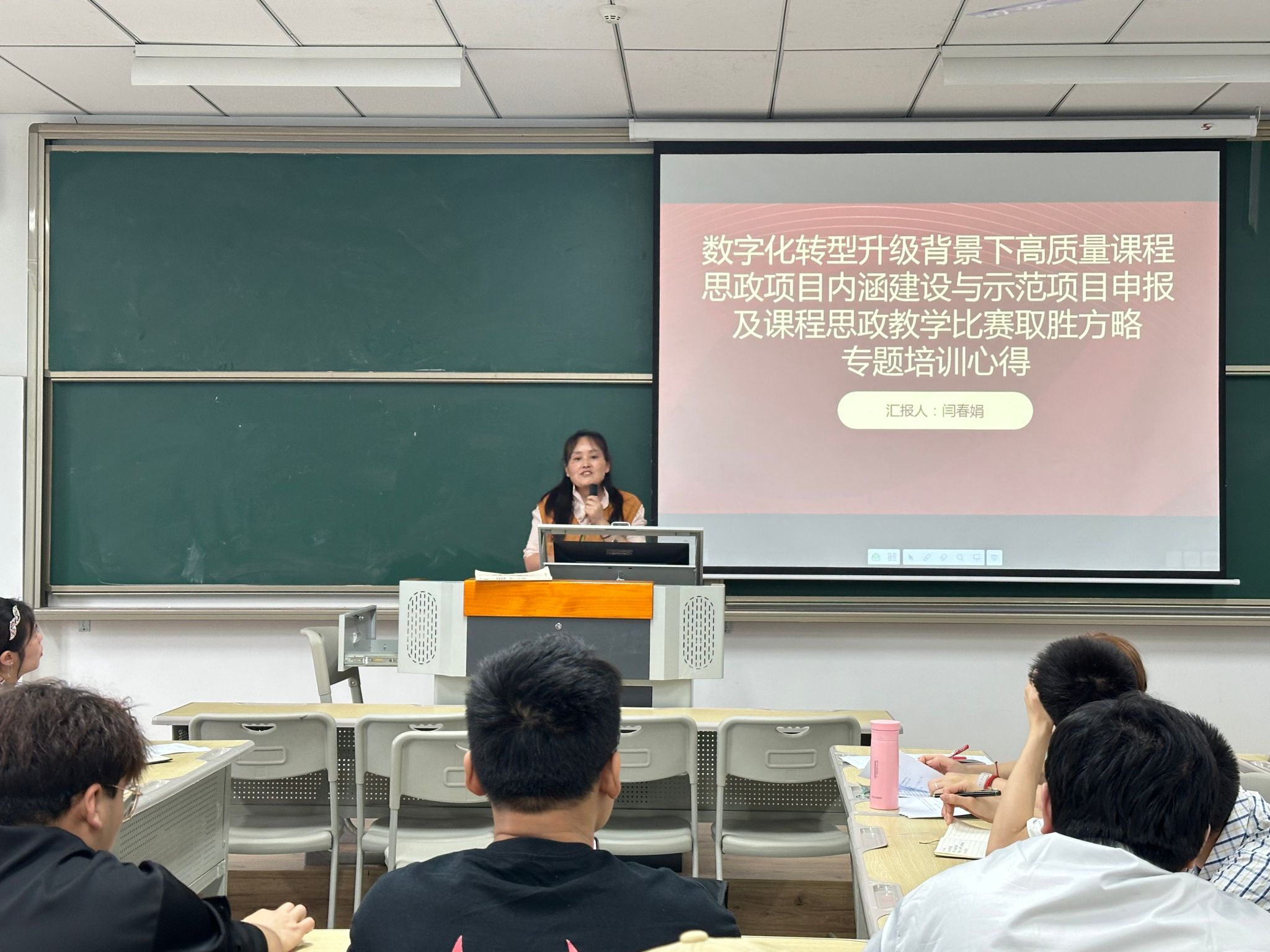 首先,闫春娟老师转述了“数字化转型升级背景下高质量课程思政项目内涵建设与示范项目申报及课程思政教学比赛取胜方略”的会议纲领,她分享到,随着教育部对高等教育质量的不断提升,借助数字化工具实现思政教育与专业教学的深度融合,结合学校办学理念,抓准“主线+专业”,即可落地到课程思政。同时,闫老师分享了多种创新教学方法,强调教师在设计课程时需融入更多的思政教育,以实现更好的教育成果。