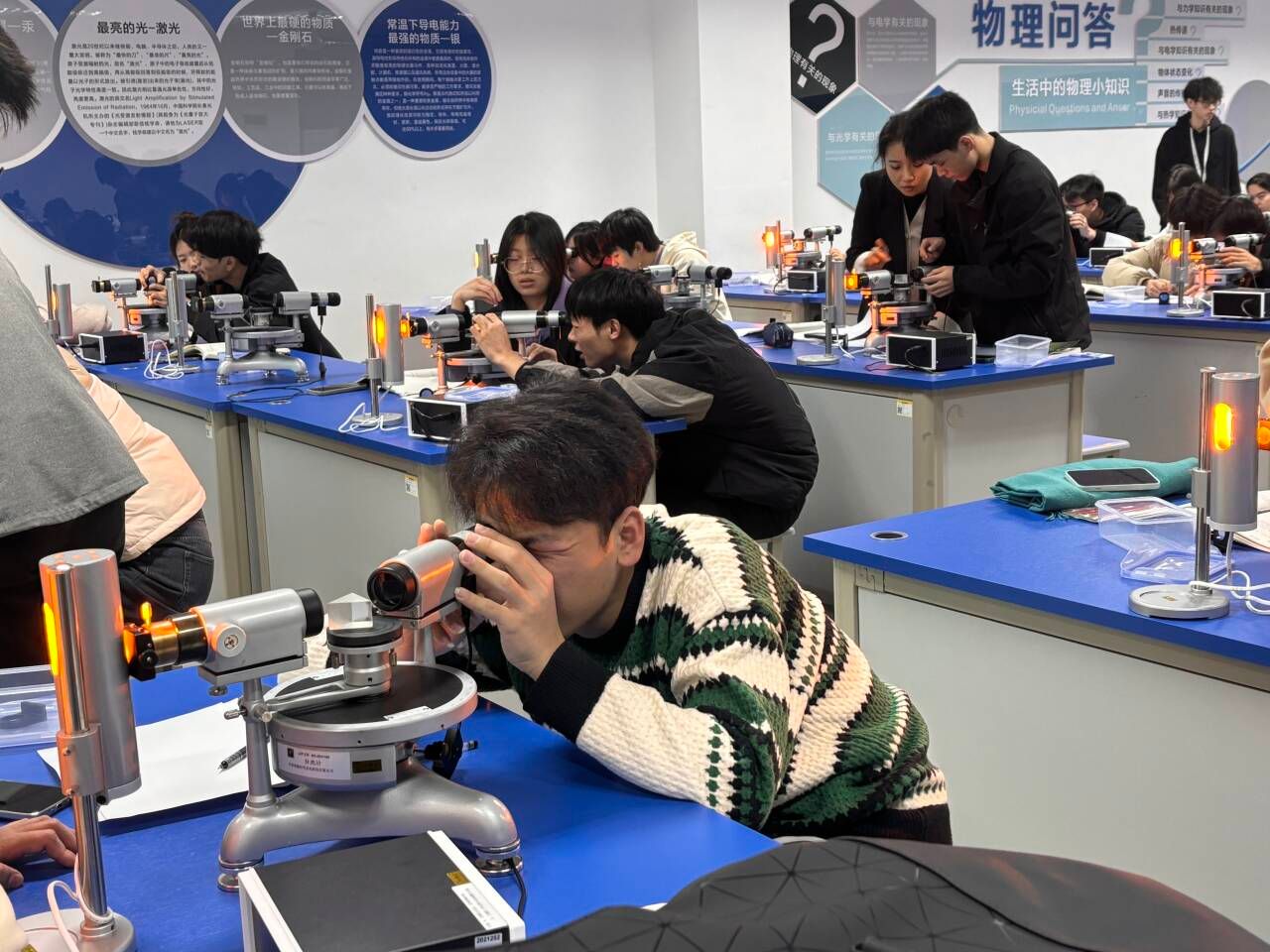 竞赛现场,参赛选手全神贯注,他们熟练地操作分光计,通过细致的光路调节、严格的测量和精确数据处理,力求得出最佳的实验数据。三棱镜折射率的测量不仅考验了学生的实验技能技巧和团队协作能力,也是学生对物理理论知识应用能力的一次实践检验。本次竞赛不仅是一场物理学科素养的较量,更是一次团队协作和创新能力的展示。学生在竞赛中展现出了极高的实验素养和团队精神,他们相互协作,共同探讨并解决实验中遇到的各类问题。