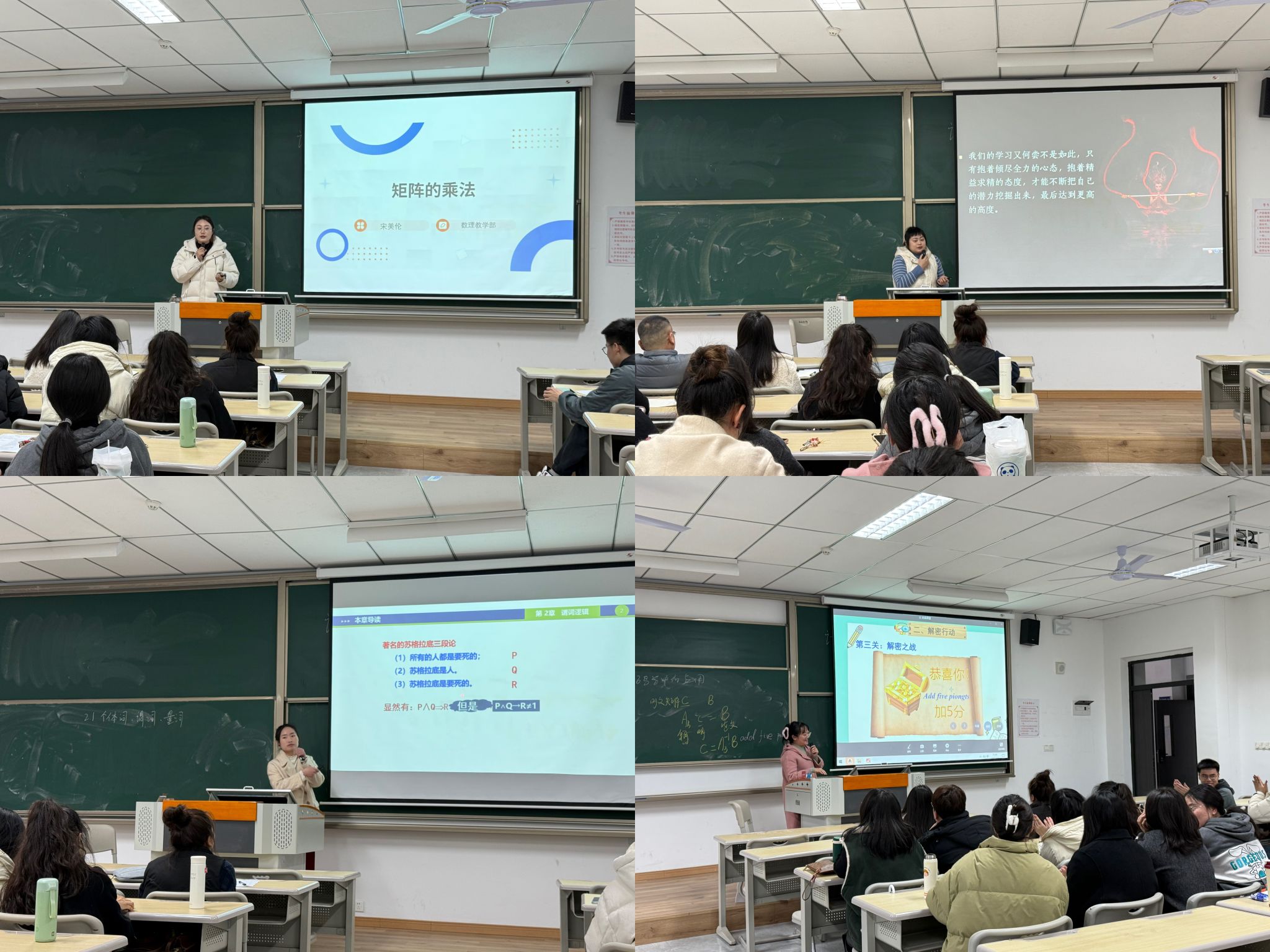 此外,宋美伦老师以日常生活中手机密码为例,生动展示了矩阵运算在密码学中的实际应用,并借此提醒同学们加强个人信息安全防护,提升网络安全意识;朱玲老师巧妙地借助古希腊哲学家苏格拉底的经典三段论,并结合了英语和语文中的语法知识,通俗易懂地讲解了谓词逻辑中的关键概念,如个体词、谓词和量词,引导学生领悟逻辑思维的严谨性;张小娟老师则将逆矩阵在密码学中的应用娓娓道来,并创新性地运用超星学习通等现代教学工具,极大地提升了学生的课堂参与度,营造了生动有趣的学习氛围;罗浩智老师紧跟时代潮流,从热门动画电影角色哪吒切入,巧妙地将马尔可夫链引入数学教学,并借此向学生传递深刻的人生哲理:只有专注于当下的自己,才能真正掌握自己的人生方向。