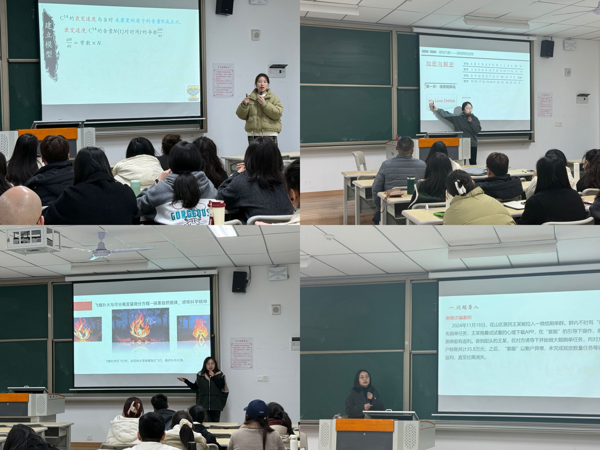 参赛教师们基于数学学科的独特性,深度剖析并提炼课程内在的思政精髓,充分展现了各自的教学创新与育人智慧。蒋琼老师以三星堆的时光密码为切入点,生动讲解可分离变量微分方程的奥秘;梁兴碧老师通过刷单诈骗的真实案例,巧妙引出贝叶斯公式的应用;雷成渝老师以加密与解密为例,深入浅出地讲解逆矩阵的实际用途,并介绍了中国密码学领域的杰出代表王小云,激励同学们以她为榜样,为国家发展贡献力量;吴小瑞老师则从“飞蛾扑火”这一自然现象出发,引申到可分离变量微分方程的教学,引导学生感悟科学探索精神。