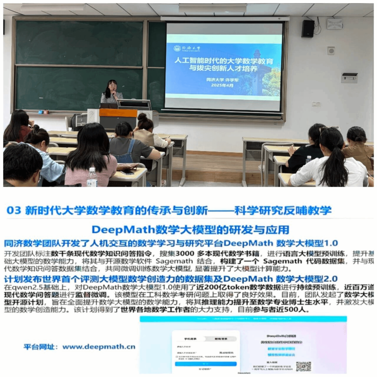 第二板块分享了同济大学许学军教授关于《人工智能时代的大学教育与拔尖创新人才培养》的见解。许教授提出,AI时代需重构课程体系,将算法思维、数据素养融入基础学科教学,同时通过“AI活动”激发学生创新能力。与会教师对此展开热烈讨论,张老师重点介绍了DeepMath数学大模型的研发与应用相关的内容,并给出软件使用平台供老师们会后深入研究。