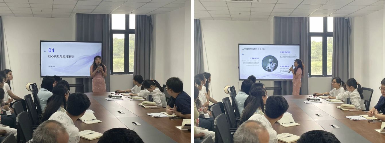 培训会最后,陈主任做了总结发言,她谈到本次培训聚焦人工智能赋能数学课程改革,叶老师从教学范式重构、技术融合实践、课程体系创新三方面展开讲解,以知识图谱可视化、智能诊断推送、跨学科实验等为例,展现AI教学优势。同时也指出知识图谱构建、内容审核等挑战,并给出应对策略。培训干货满满,为教学改革提供了新思路与方法。希望大家学以致用,共同推进数学教学创新发展!