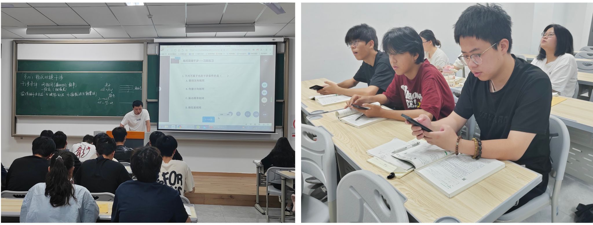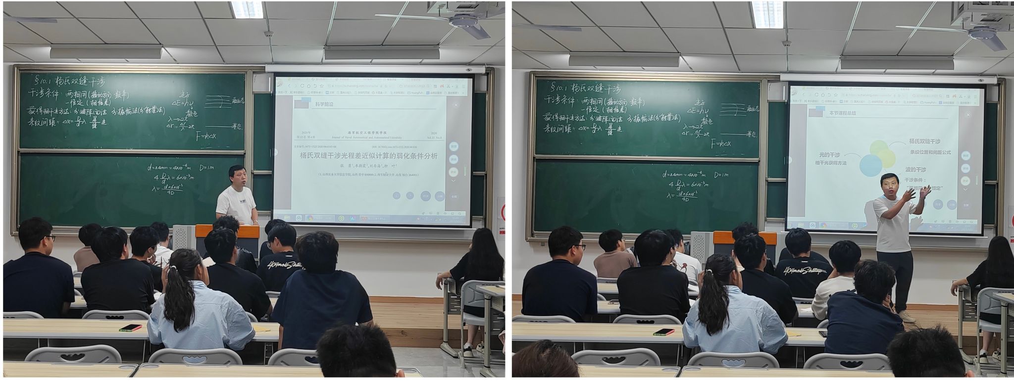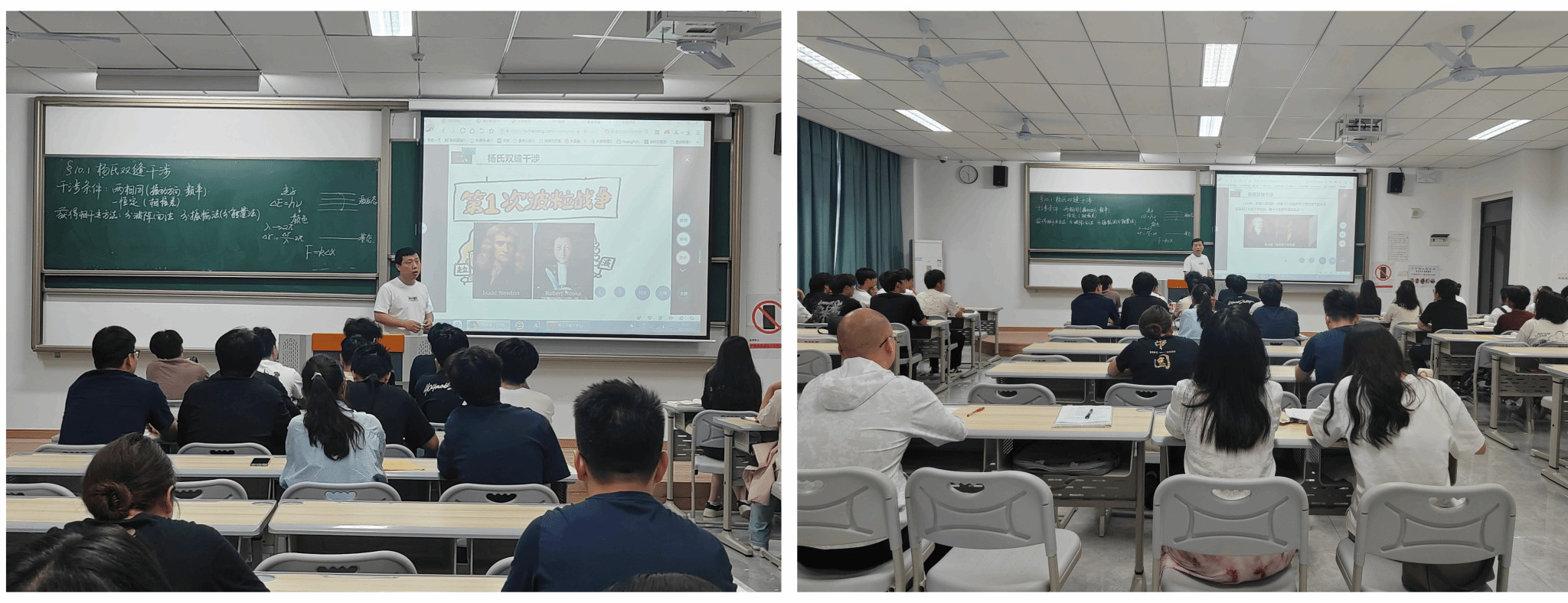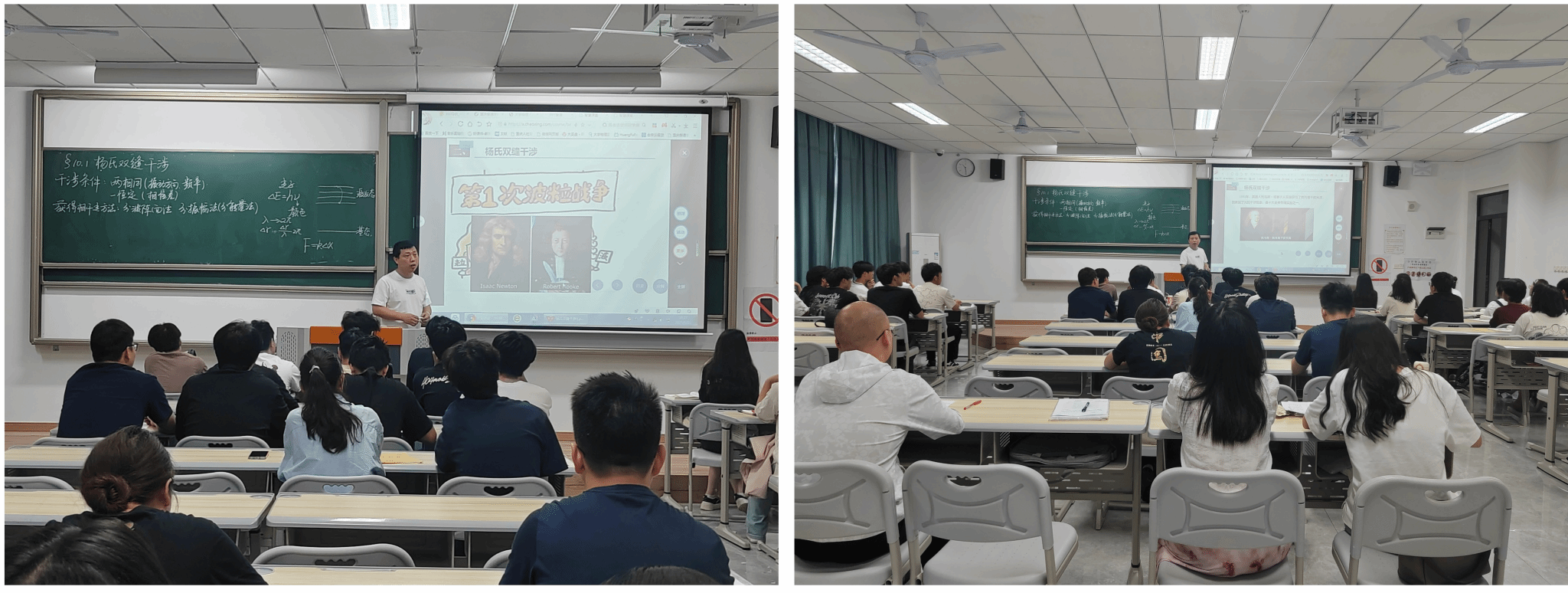 为积极迎接我校本科合格评估,全面提升数理教学部的教学质量,夯实教师教学基本功,营造浓厚的教学研讨氛围,2025年5月22日第三节课,数理教学部部分教师走进周桐辉老师的课堂,共同开展以“波动光学之杨氏双缝干涉”为主题的磨课活动。此次活动旨在通过深入研讨与交流,进一步优化教学过程,提高课堂教学的实效性,为培养高素质人才筑牢根基。