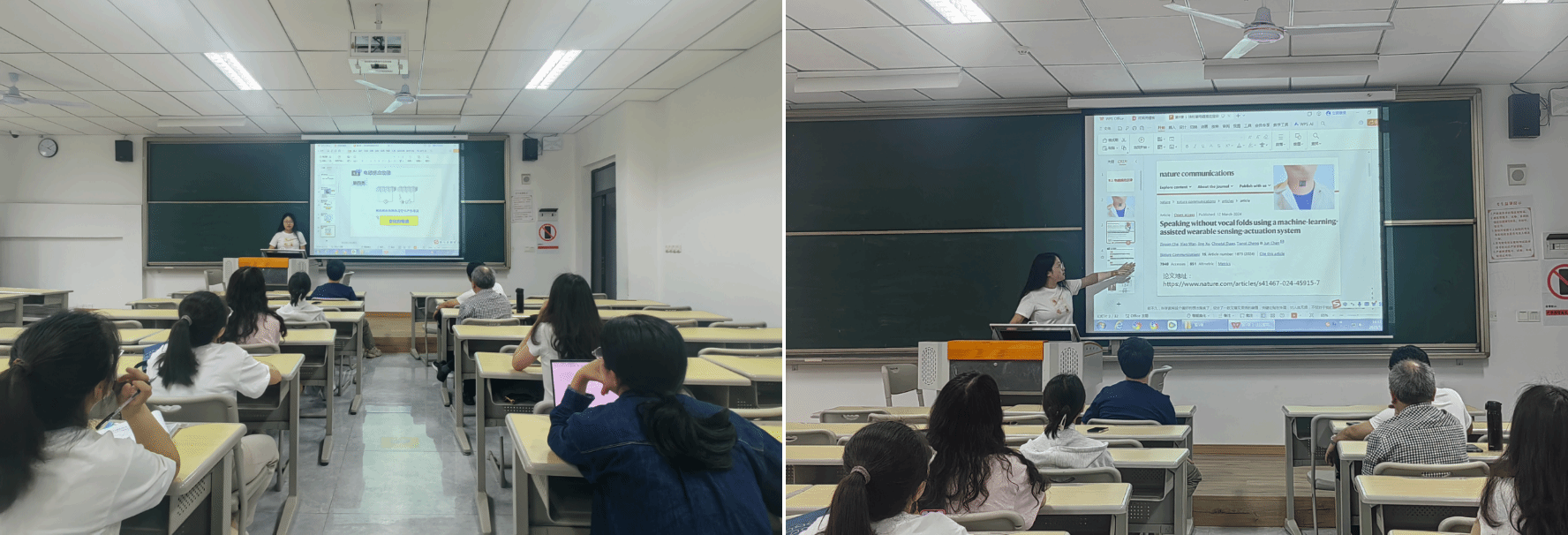 5月15日第2节,朱老师在仁者楼408教室进行了第三轮“过关磨课”,数理教学部无教学任务的教师及学生共同参与。课堂以“喉咙贴片”的生活实例引入,通过问题“同学们有没有遇到过喉咙不舒服导致发不出声音的时候?”激发学生兴趣,自然过渡到电磁感应的前沿动态。