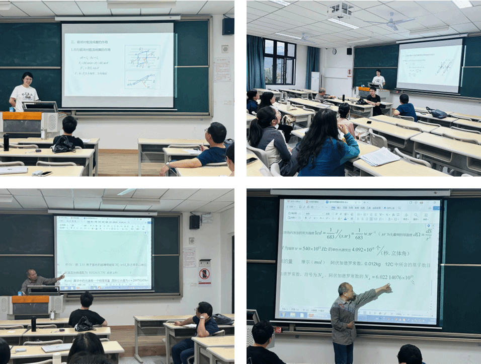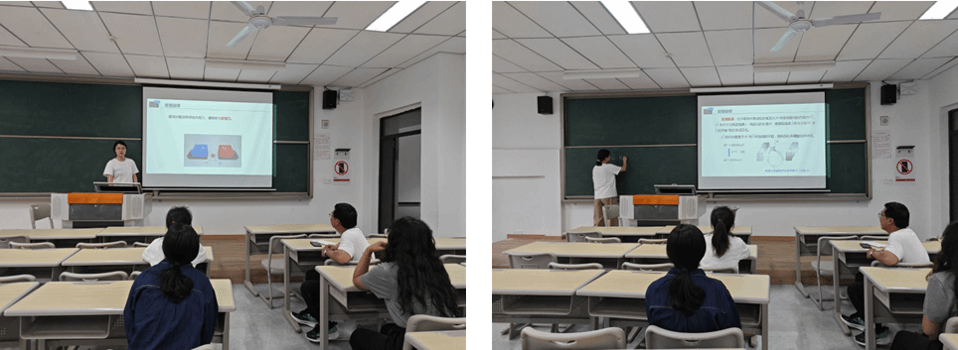2025年4月16日,首轮课程组磨课在行者楼102教室拉开帷幕。刘瑞娴老师以静电场和稳恒磁场的类比为切入点,试图巧妙引导学生从静电场中电荷所受库仑力的公式,推导出电流元在磁场中受到安培力的公式,帮助学生建立知识间的联系,激发学生对新知识的好奇心。在讲解过程中,刘老师深入分析通电直导线在磁场中的受力情况,并拓展至通电线圈在稳恒磁场中的受力分析。为增强知识的实用性,刘老师将通电线圈引申到生活中的风扇、电动机等应用实例,让学生深刻认识到物理知识在生活中的广泛应用。