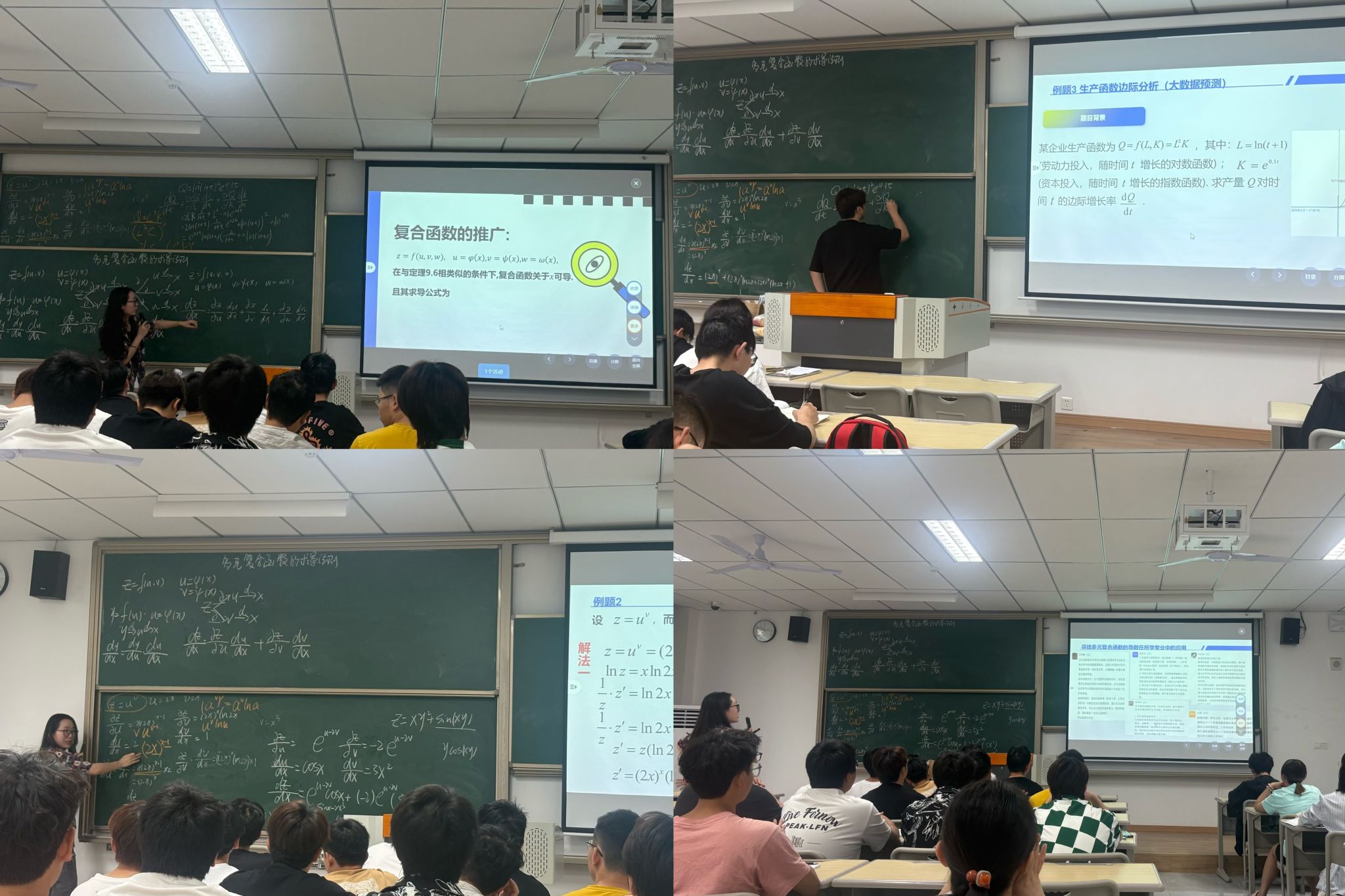 经历两轮打磨后,5月13日,屈老师在行者楼305教室迎来了部门“过关磨课”,綦江校区数理教学部全体无课教师现场观摩指导。她首先系统梳理一元复合函数求导的链式法则,通过类比迁移的数学思维方法,引导学生逐步推导出二元复合函数求导的链式法则。在此基础上,进一步以学生为主体,启发学生自主探索并推导三元复合函数求导的链式法则,实现知识体系的螺旋式深化。在计算教学中,她组织学生讨论总结方法,总结出链式法则的口诀,助力学生构建便捷的思维工具。 随后结合数据科学与大数据技术的专业特点,抛出“寻找多元复合函数的导数在所学专业中的应用”的问题并给出结合实际背景的例题,搭建起数学理论与专业领域的认知桥梁。教学过程中,她灵活运用学习通平台随机选人功能激活课堂氛围,结合传统板书动态演算与学生上台实践演示,形成师生多维互动、理论实践交融的教学生态,最终实现知识内化高效达成与课堂效能显著提升。