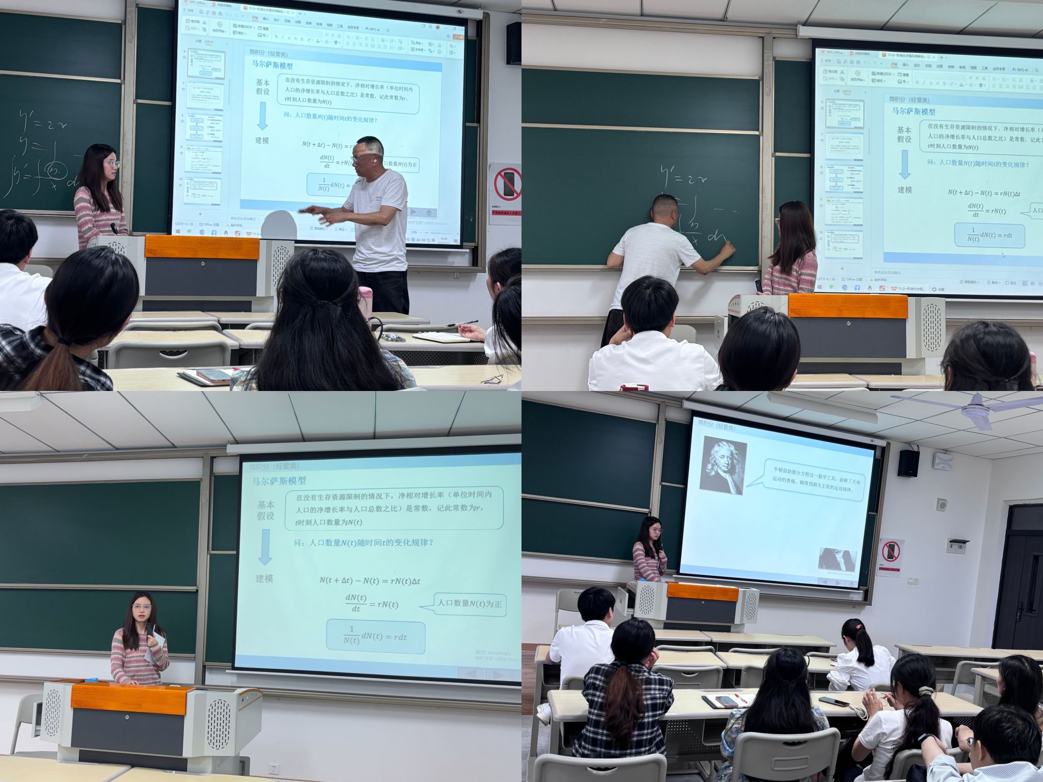 经历两轮打磨后,童老师于5月29日正式在课堂上开展了第三次过关磨课活动,数理教学部中无教学任务的教师均参与了此次磨课,共同为教学质量提升助力。在课程实施中,童老师融合信息化教学手段,依托学习通平台实现了智能化签到管理,有效保障了课堂出勤率。在教学内容设计方面,创新性地采用人口增长案例视频作为课程导入,巧妙引出马尔萨斯模型,并以此为载体自然过渡到可分离变量概念的教学。同时,借助经典例题详细讲解可分离变量微分方程的求解方法,组织学生分组讨论并总结出求解步骤。此外,童老师严格贯彻OBE教育理念,采用“精讲多练”的教学模式,并借助学习通让学生巩固练习。课程结尾,回归马尔萨斯模型解决人口增长问题,实现知识传授与课程思政的有机融合。
