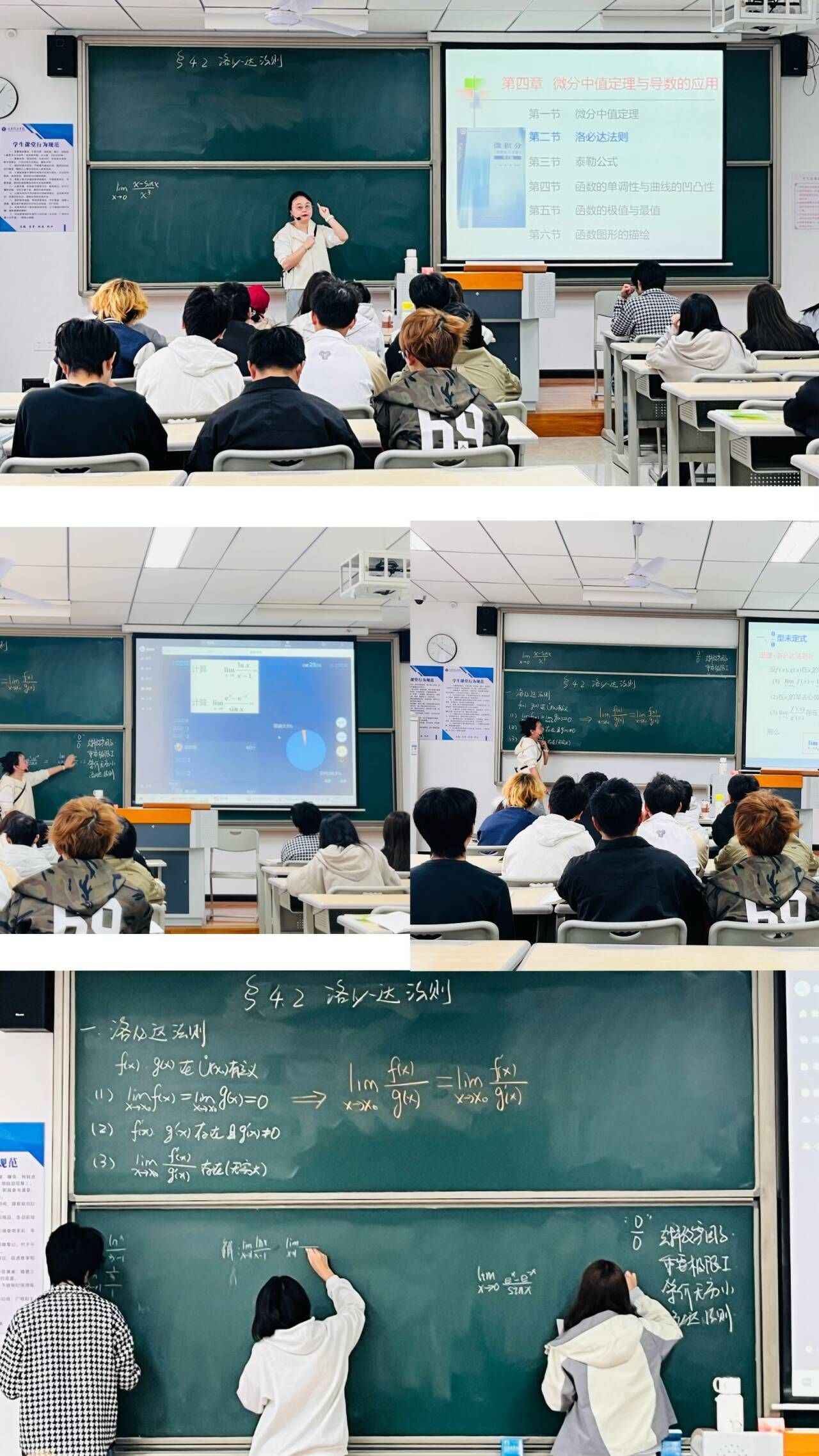 10月22日,雷老师结合首轮磨课建议优化《洛必达法则》教学设计,并在南州食堂 415 向教研室全体教师展示。课堂开篇,借助动态 PPT,一边清晰呈现传统方法求解极限的完整过程,一边同步展示无法用以往思路破解的极限实例,通过鲜明对比巧妙引发学生认知冲突,自然导出洛必达法则的学习需求;在引入法则历史背景时,采用简洁的口头讲解避免课堂节奏拖沓,课后则通过学习通推送“洛必达法则发展史”拓展阅读材料,让思政元素在延伸学习中实现深度渗透,教学设计兼具逻辑性与实用性。