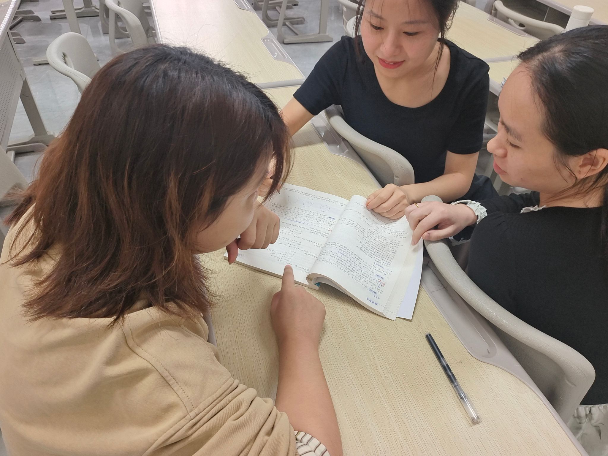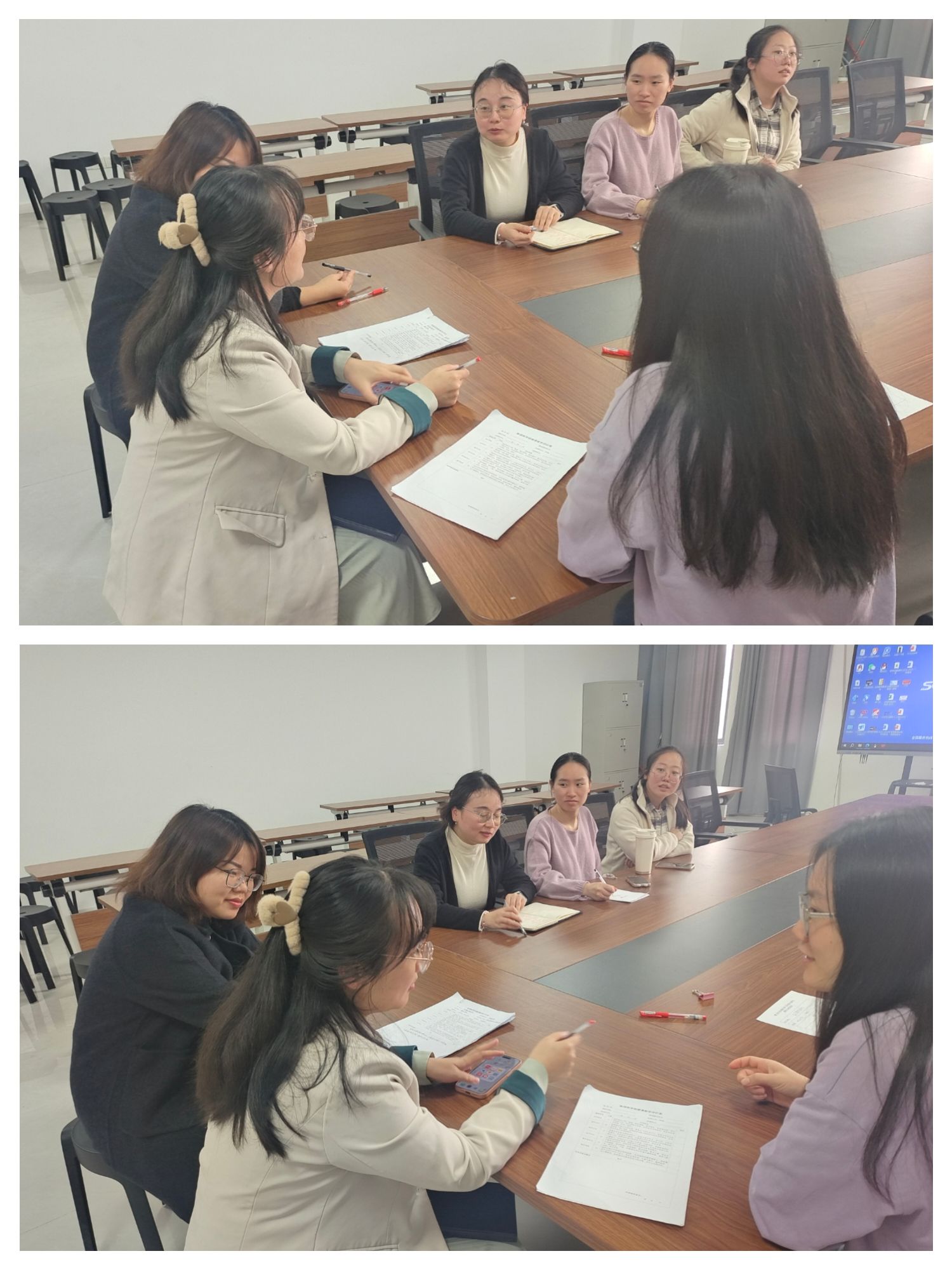 首轮磨课结束后,谭老师根据课程组建议进行设计改造,在教研室磨课会议中,谭艳菲老师结合PPT完整演示了教学过程。教研室教师围绕教学逻辑、讲解清晰度和学生参与度展开第二轮点评,边梦柯老师指出课堂“以教师讲授为主、学生被动接收”的问题,建议增加互动式课堂活动设计;张小娟老师补充强调活动需严格控制时长;朱玲老师提出要灵活调整活动难度,兼顾不同基础学生。针对这些建议,教研室最终敲定完善方案:在PPT中插入“活动提示页”明确流程节点,同时设计应急预案---若学生参与度不足,则由课堂积极学生带头引导,确保教学流程顺畅推进。