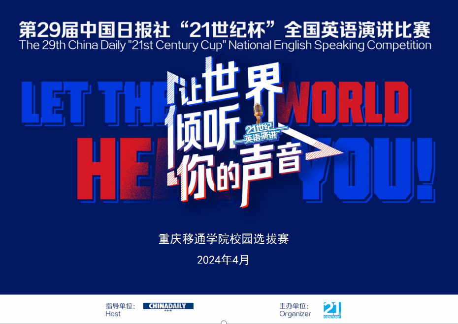 “21世纪杯”全国英语演讲比赛高举习近平新时代中国特色社会主义思想伟大旗帜,全面贯彻落实党的二十大精神,为提高中国青年讲好中国故事的能力水平,为加强我国国际传播能力建设、促进文明交流互鉴、推动构建人类命运共同体凝聚青春力量。活动以“让世界倾听你的声音”为口号,坚持公益、自愿参与的原则。我校决定组织参加中国日报社和21世纪报社联合举办的第29届中国日报社“21世纪杯”全国英语演讲比赛。该赛事分为校赛、省赛、全国决赛三个阶段,现将有关事宜通知如下: