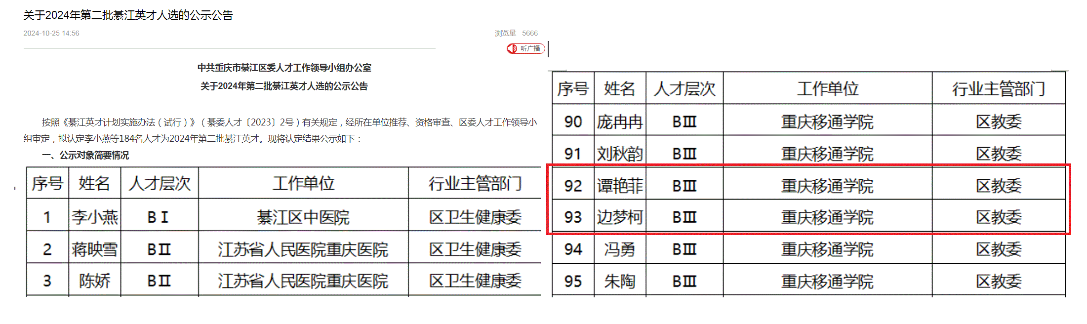 按照《綦江英才计划实施办法(试行)》(綦委人才〔2023〕2号)有关规定,经所在单位推荐、资格审查、区委人才工作领导小组审定,由中共重庆市綦江区委人才工作领导小组办公室公示,数理教学部的边梦柯、谭艳菲两位教师被认定为2024年第二批綦江英才。