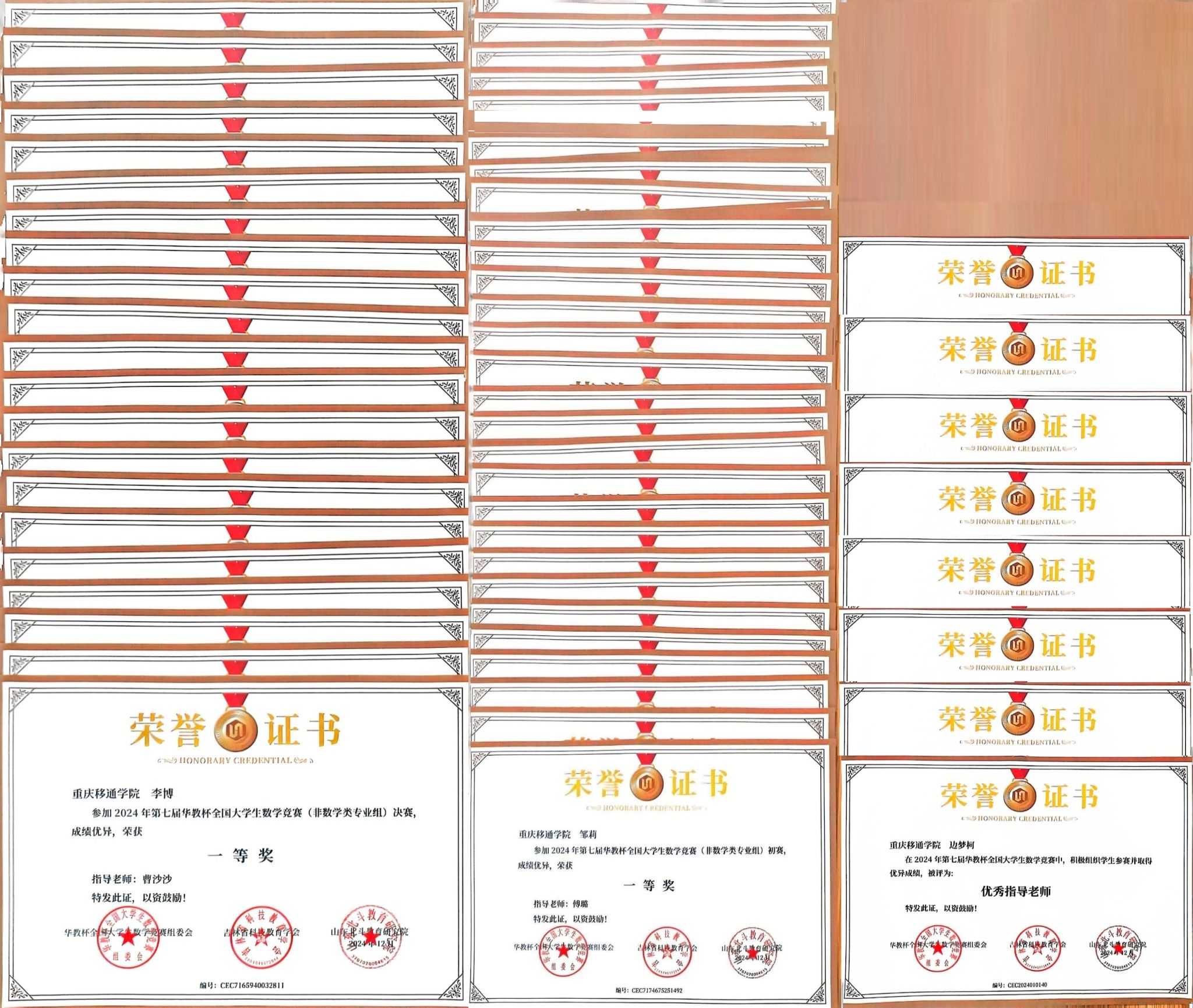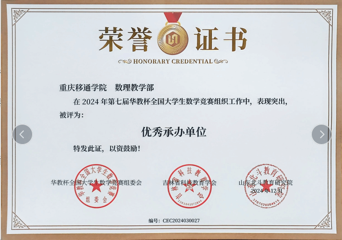 在该赛事中,重庆移通学院连续两届荣获“最佳承办院校”。数理教学部因在本届竞赛组织工作中表现突出,被评为“优秀承办单位”;部门边梦柯(綦江)、叶彩虹(綦江)、罗浩智(綦江)、张佳宁(綦江)、程龙(綦江)、傅璐(綦江)、伍君芬(合川)、陈素素(合川)积极组织学生参赛并取得优异成绩,被评为优秀指导教师。
